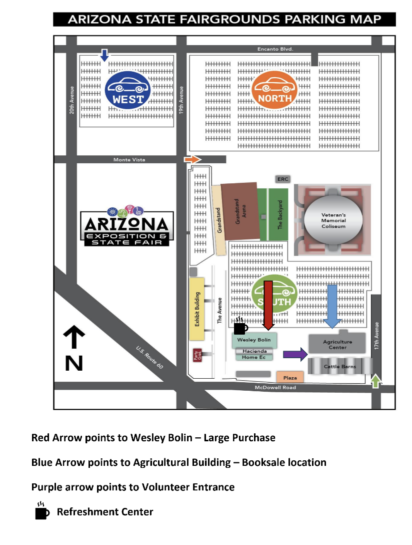 Enter the State Fairgrounds from 19th Ave. and Monte Vista entrance (sale shoppers will enter at McDowell and 17th Ave.). Park in the lot west of the Ag Center (between the Ag Center/book sale and the Wesley Bolin/large purchase/refreshment center). If that lot is full, park as close as possible.